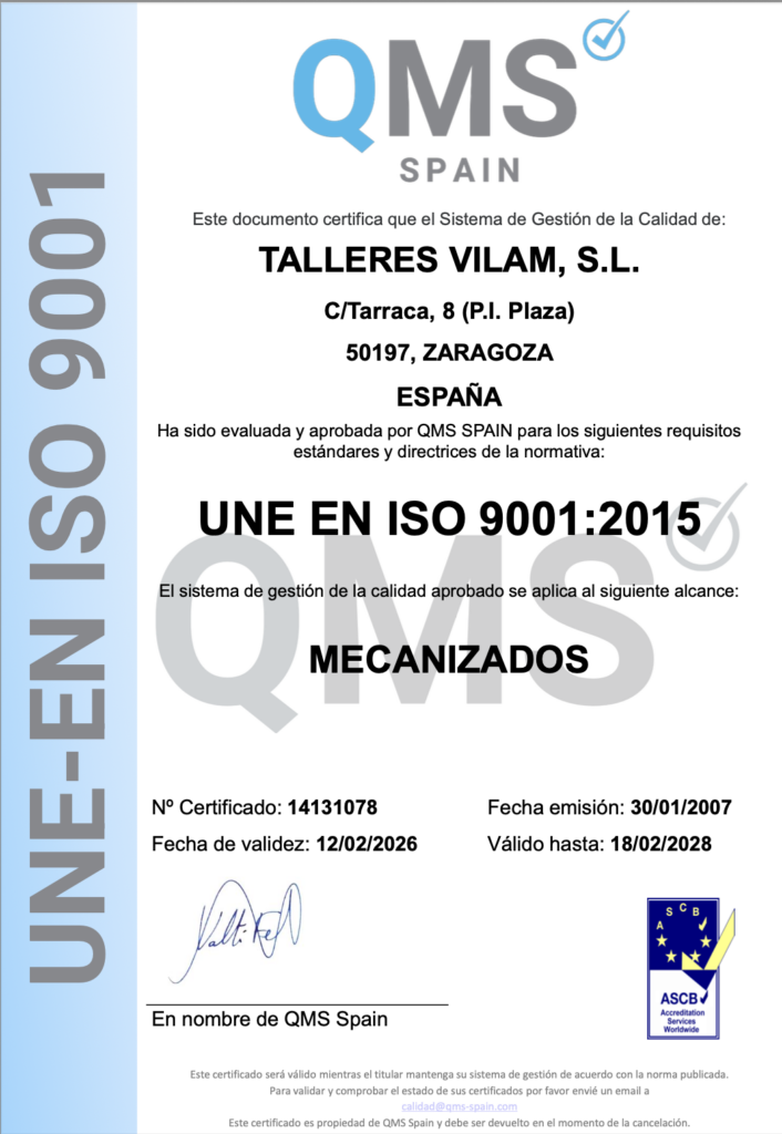 Talleres Vilam, en su firme apuesta por ofrecer un servicio de calidad, es certificada y auditada bajo norma ISO 9001:2015 desde el año 2007.
